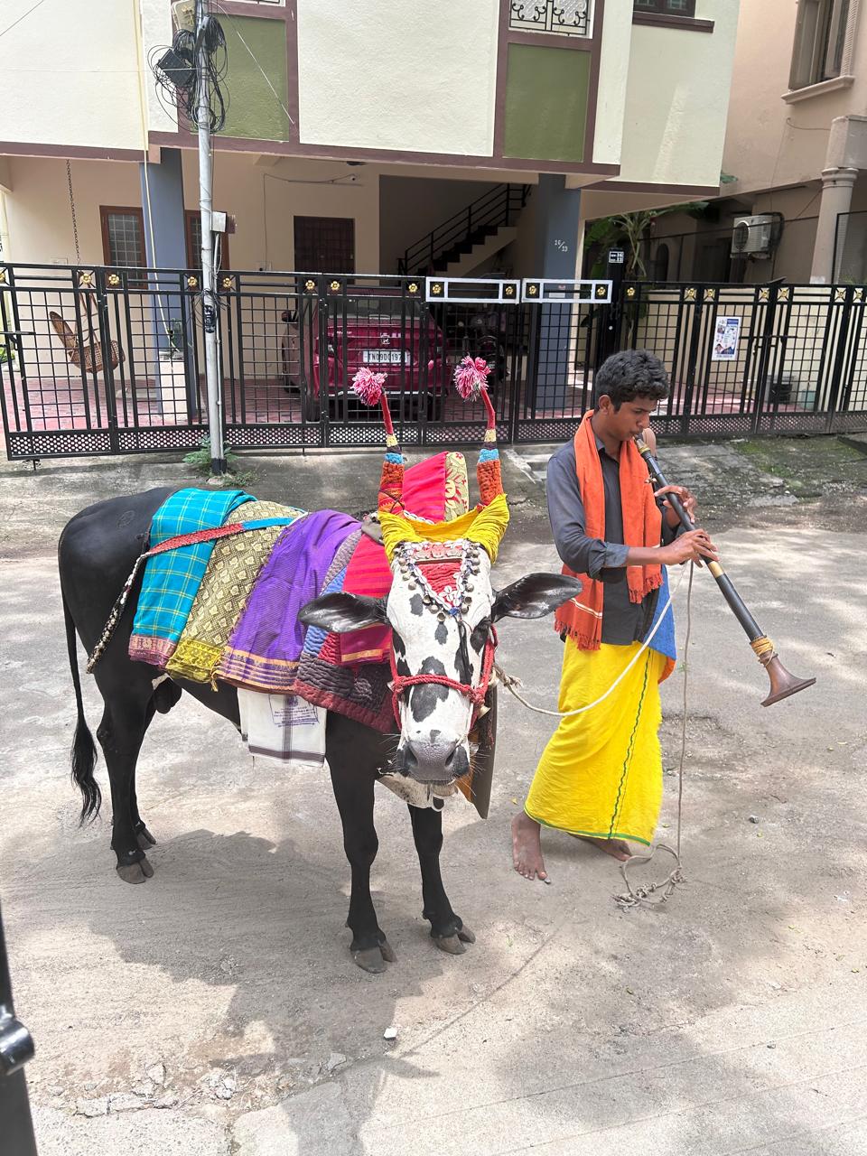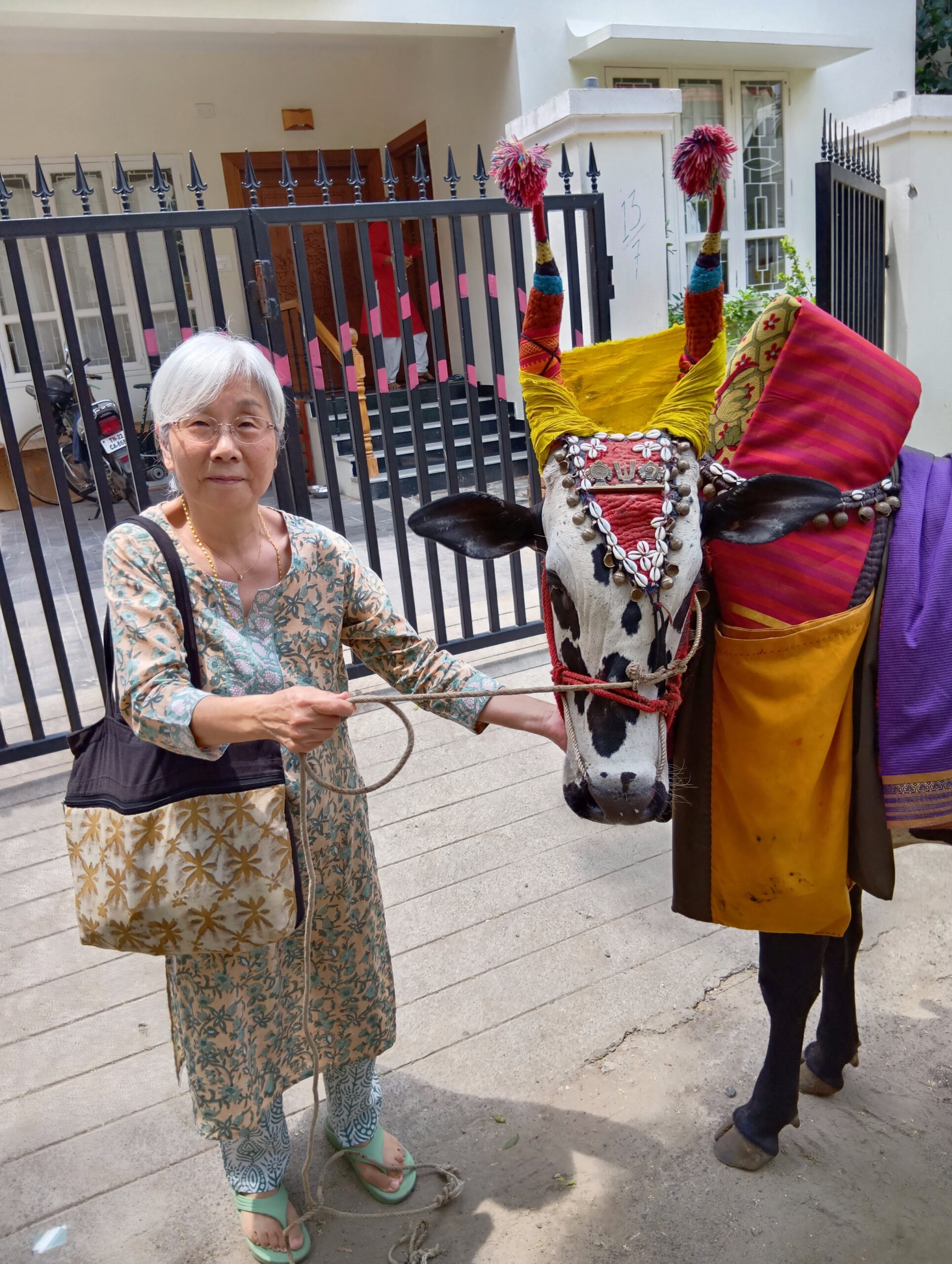 幸せを呼ぶ牛 Bum bum maadu 2025年8月26日By matoba Blog これからヴィーナのレッスンが始まろうとした時に、いきなり外に門付けの牛が現れた。着飾った子牛を連れて家々を回り、祝福を届ける。牛を連れた男の子が「この家に幸が訪れる!」と言うと牛がうんうんと頷くように躾けられているのだとか。 250826112016421 投稿ナビゲーション 浦和の延命寺花祭りに出演します。Veena Mahotsavam 2025 108 veena nadanjali